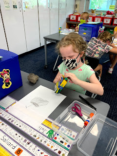 by Rebecca Kai Dotlich. Then, we drew and labeled ourselves as a scientist. Afterwards, we examined rocks closely as scientists do and we drew and labeled our rocks.
