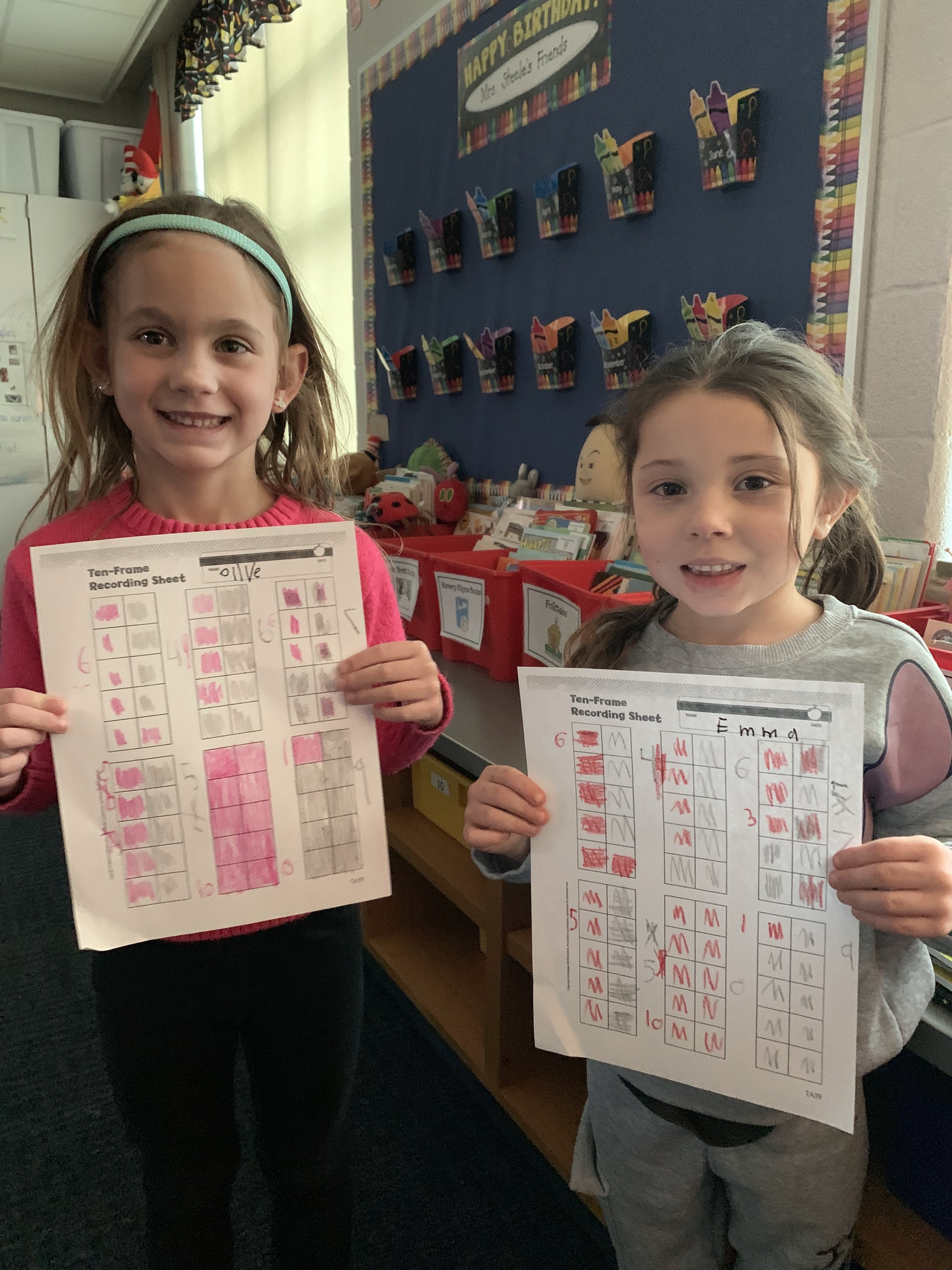 In math, children worked with partners using ten frames to explore number pairs that add to 10.